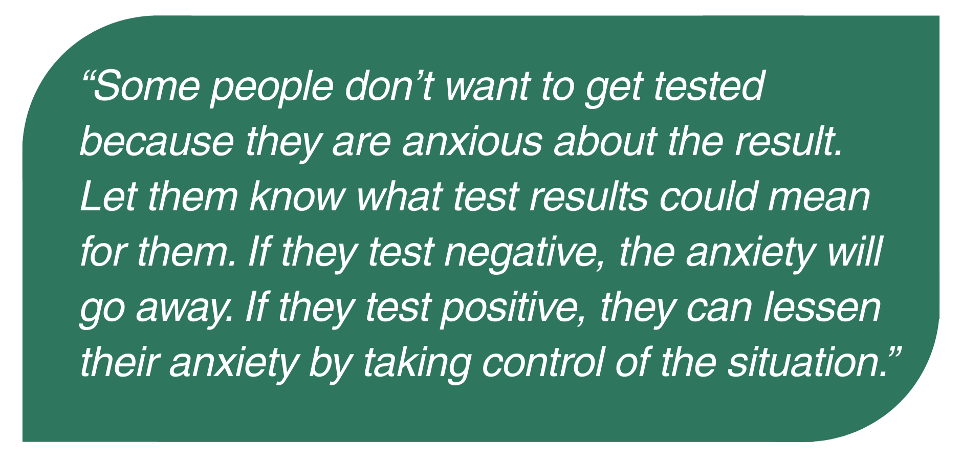 Some people don’t want to get tested because they are anxious about the result. Let them know what test results could mean for them. If they test negative, the anxiety will go away. If they test positive, they can lessen their anxiety by taking control of the situation. They can be more aware of changes in their body, and physicians may take their concerns more seriously. If they are worried about costs or lack access to services, you can refer them to resources such as ConnectMyVariant navigators who may be able to help.