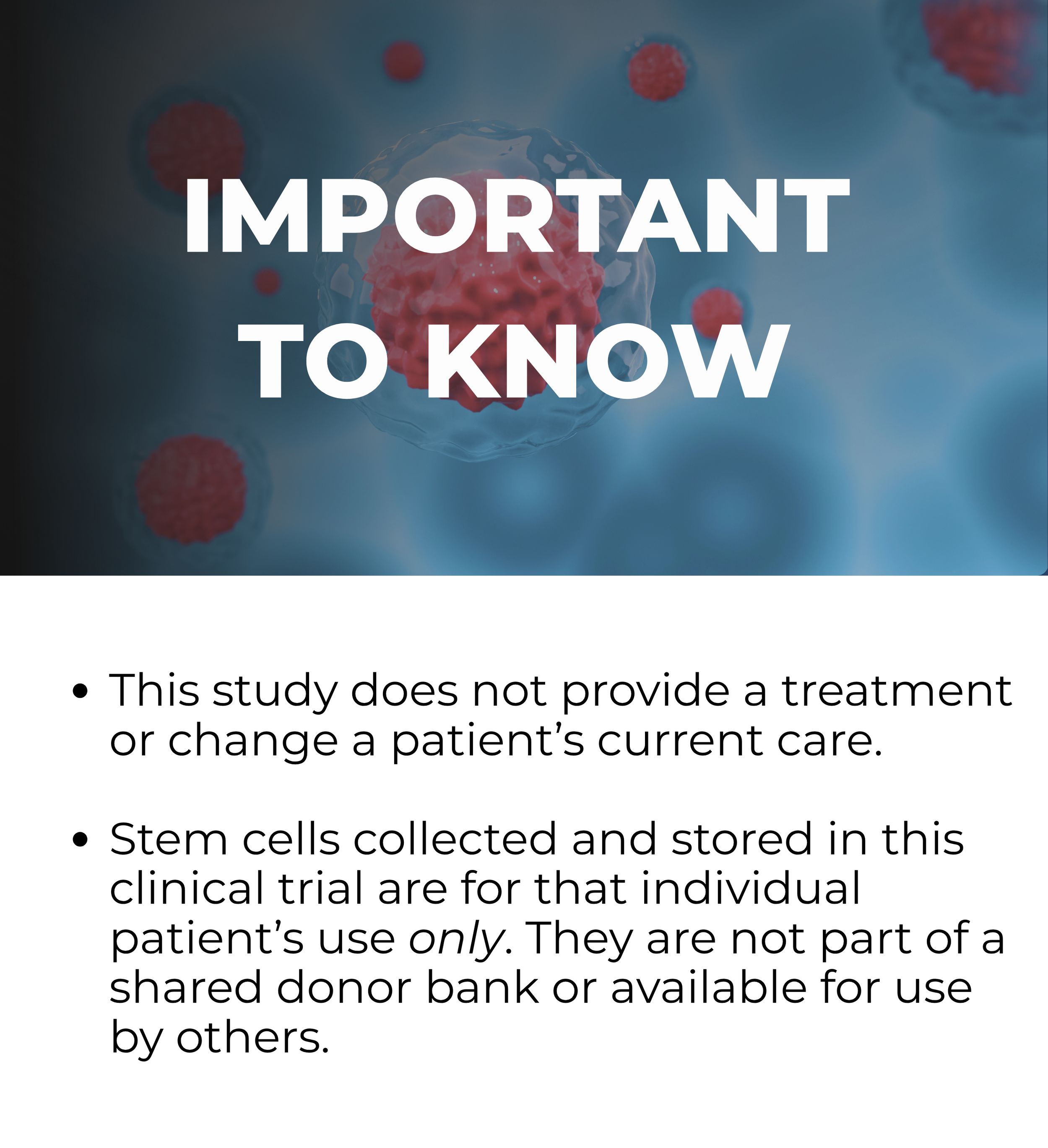 Cells collected in this study are stored for that patient’s use only and are not part of a shared donor bank.